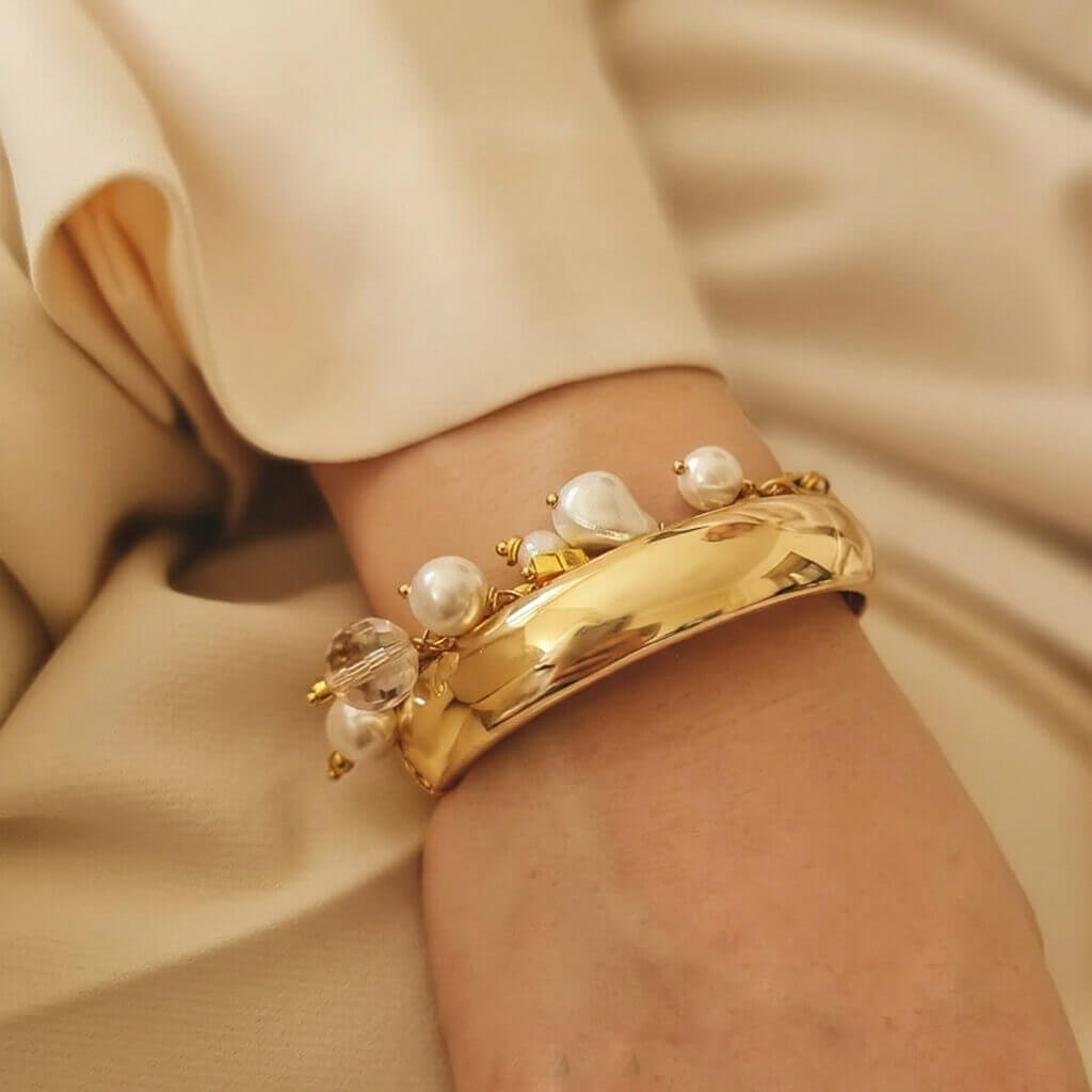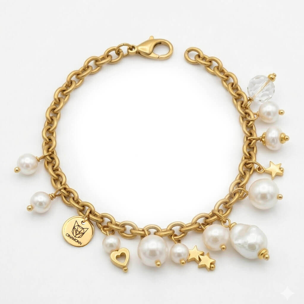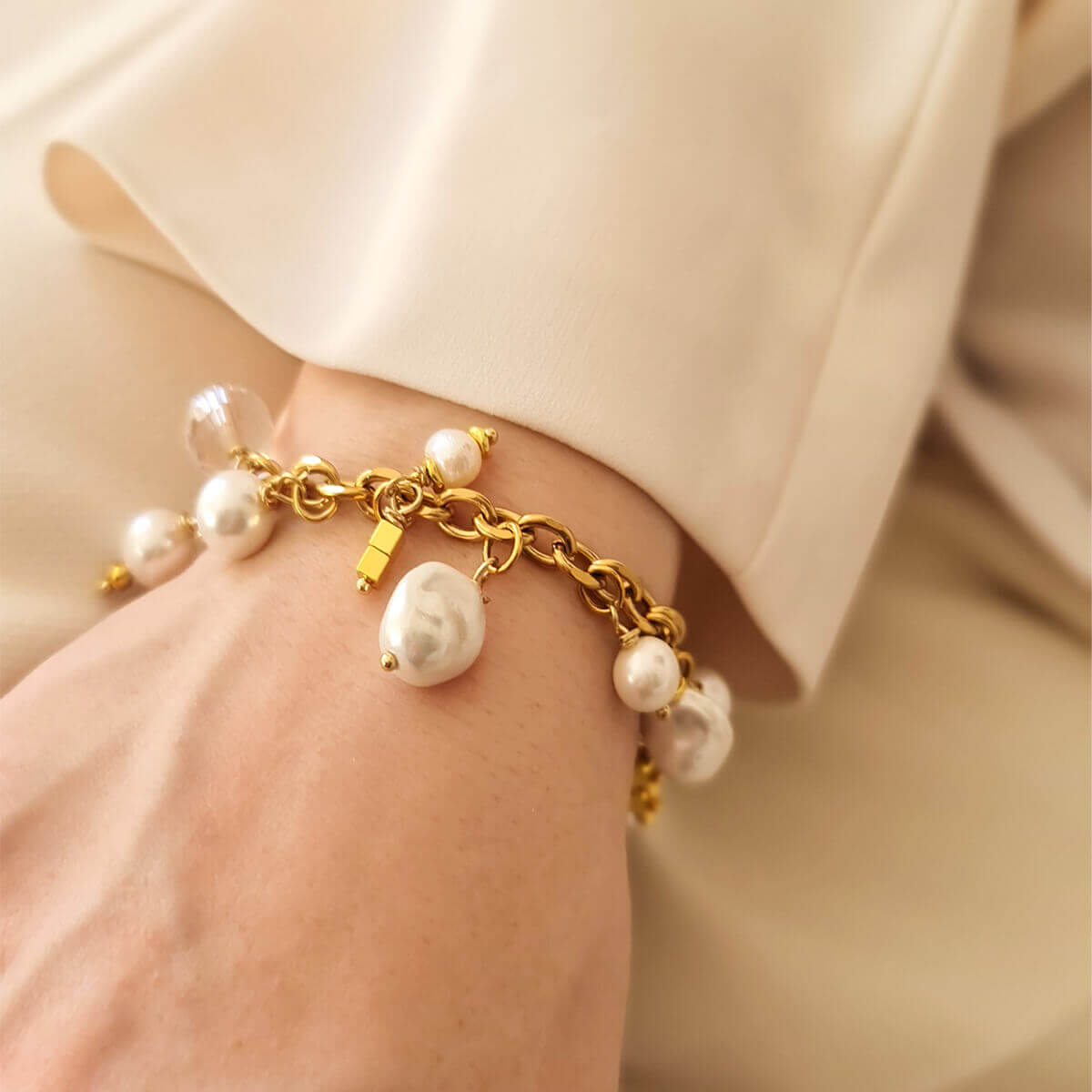 Sukurta iš stambios aukso spalvos plieno grandinės ir perlų.