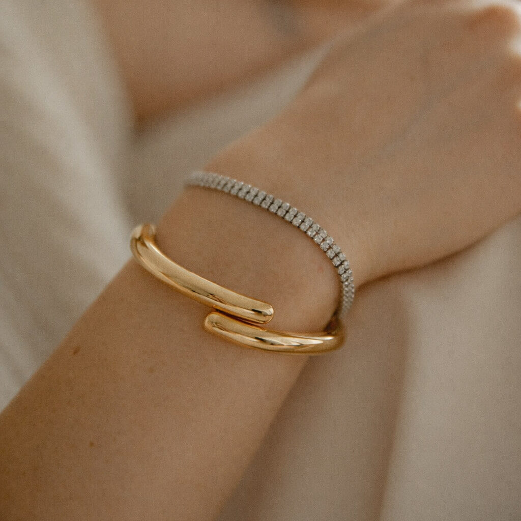 Apyrankė pasižymi glotniu, veidrodiniu aukso paviršiumi ir subtiliai persidengiančiais galais, kurie suteikia modernų, išgrynintą siluetą.