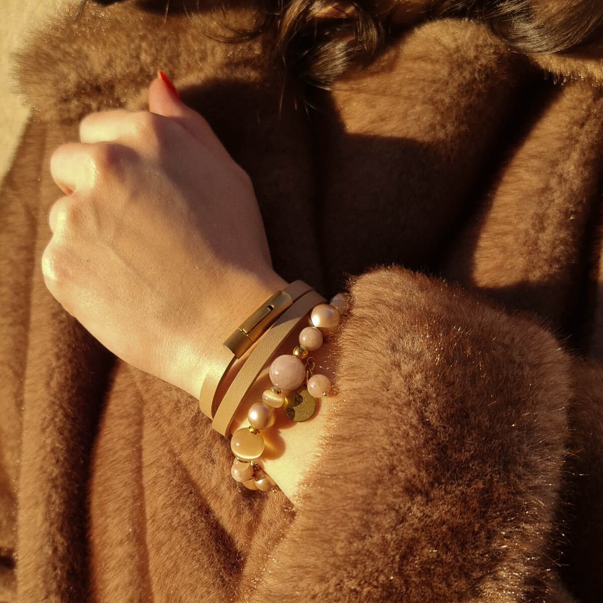 Šį komplektą sudaro natūralios odos dviejų eilių apyrankė su nerūdijančio plieno užsegimu bei natūralių akmenėlių apyrankė ant gumytės.