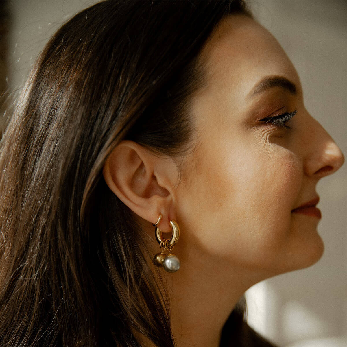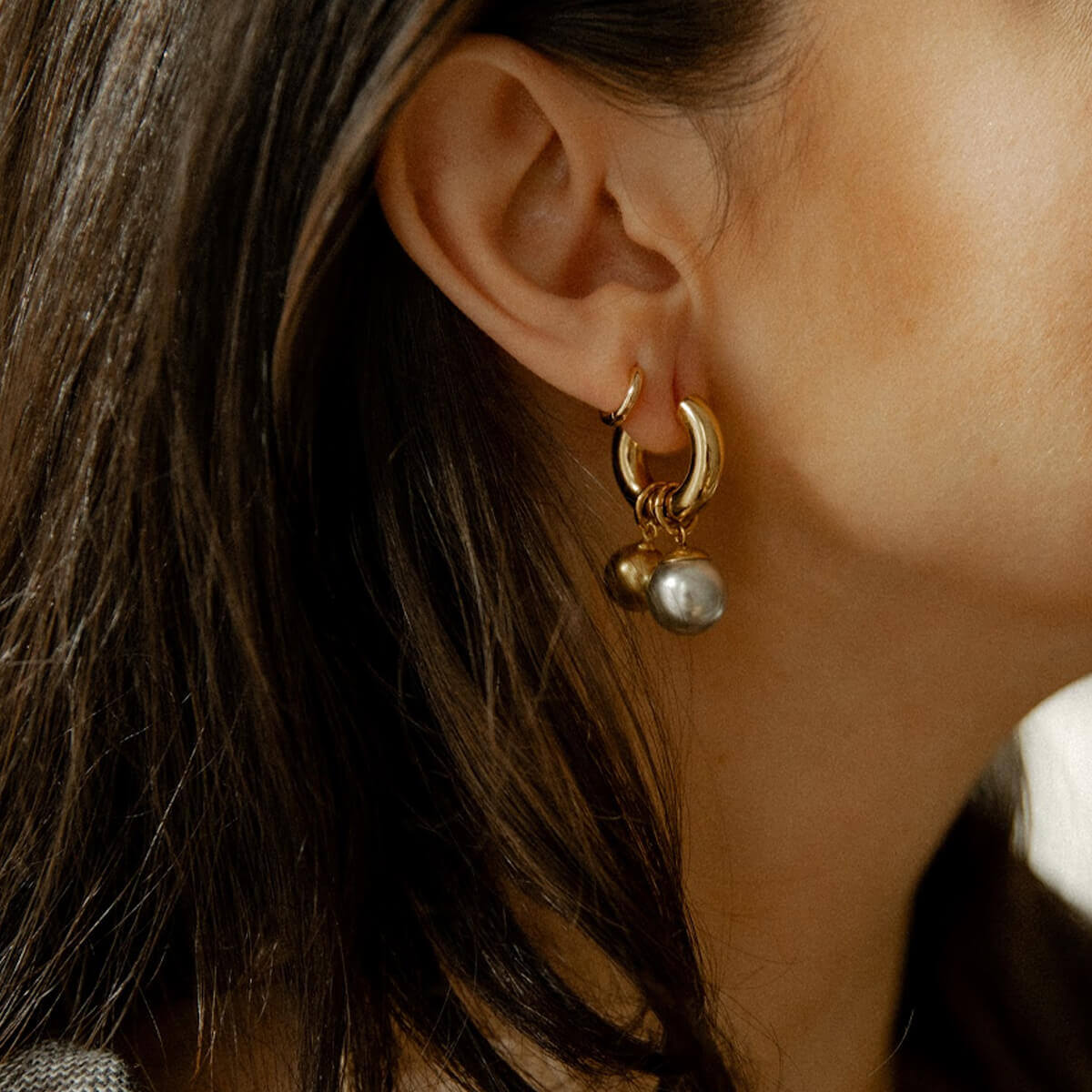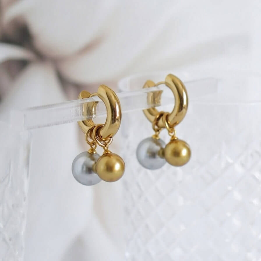 Auksinis ir pilkas perlas kuria harmoningą kontrastą – lyg šviesa ir šešėlis, diena ir vakaras. Minimalistinė auskarų forma suteikia lengvumo, o judantys perlai subtiliai atspindi šviesą.