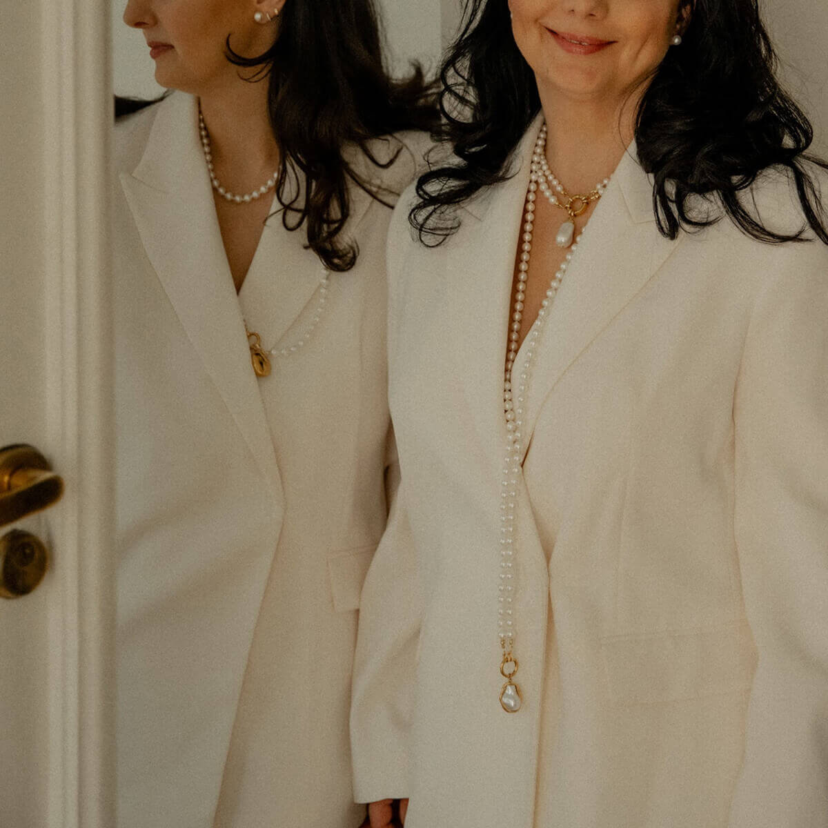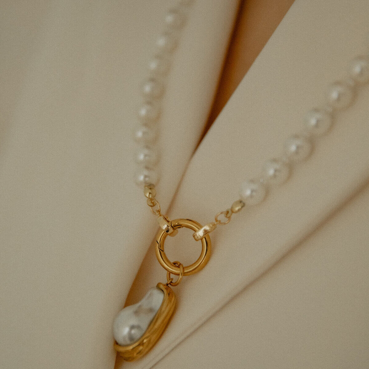Klasikiniai perlai kuria švelnų, laikui nepavaldų įspūdį, o nuimamas pakabukas leidžia dar labiau keisti vėrinio charakterį – nuo minimalistinio iki išskirtinio akcento.