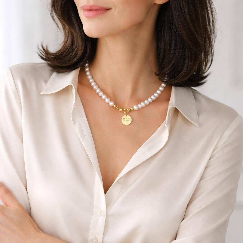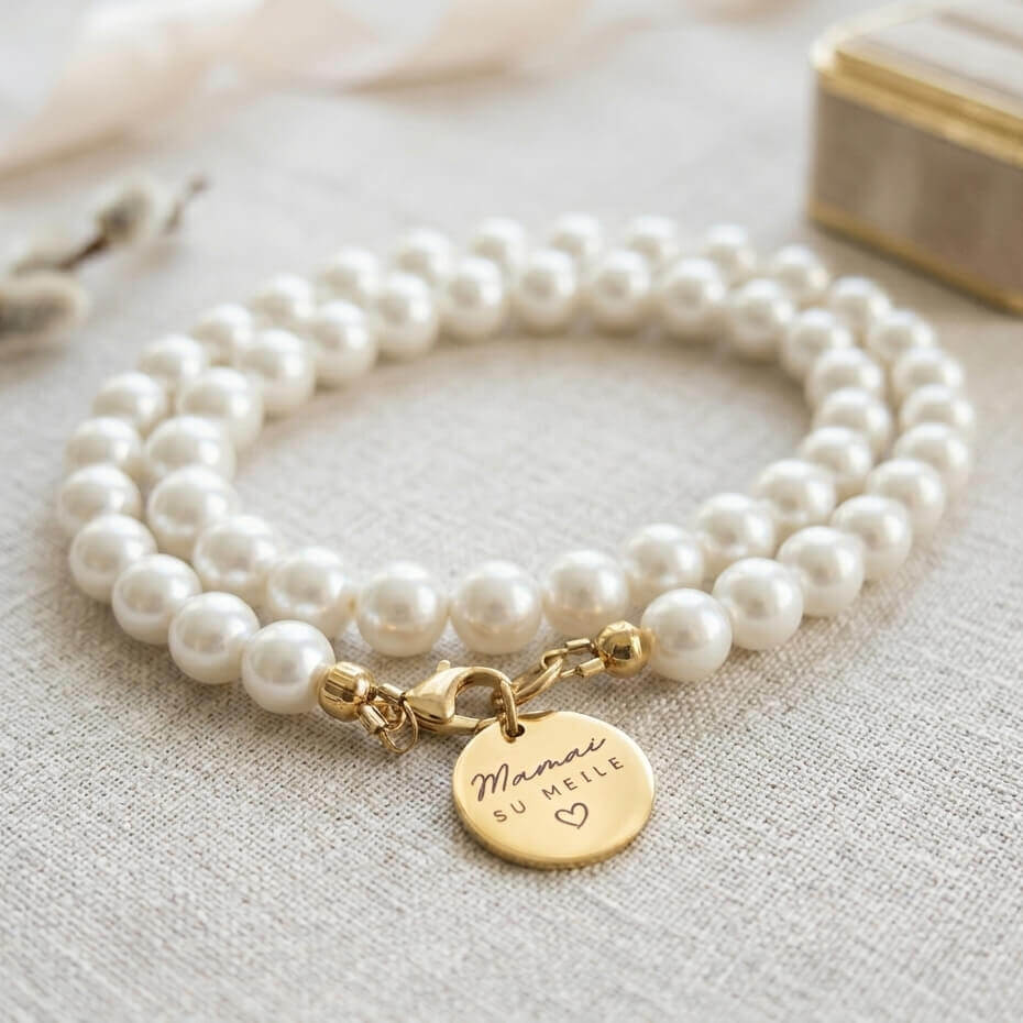 Klasikinis perlų vėrinys su auksuotu pakabučiu, ant kurio išgraviruota ,, Mamai, SU MEILE”.