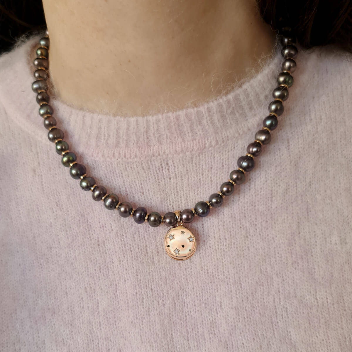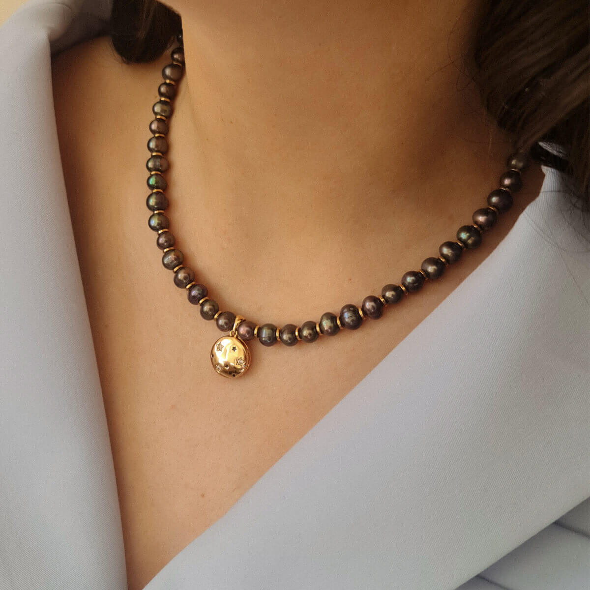 Šis vėrinys pagamintas iš natūralių tamsių perlų, tačiau turi savyje daugybę atspalvių ir tiks prie visų aprangos dėrinių.