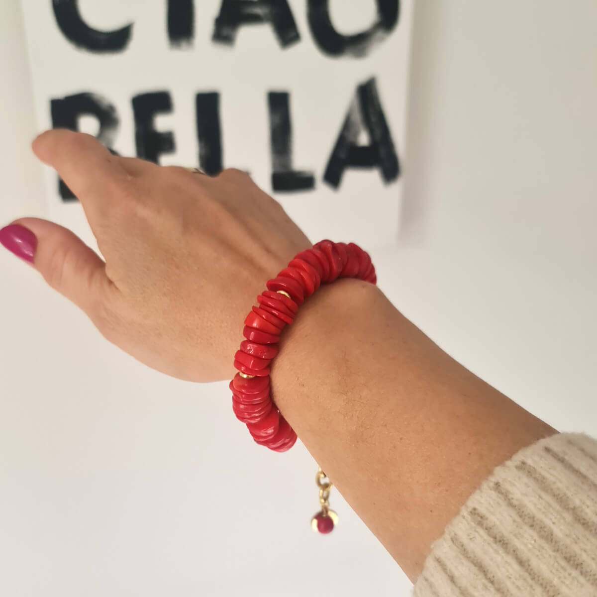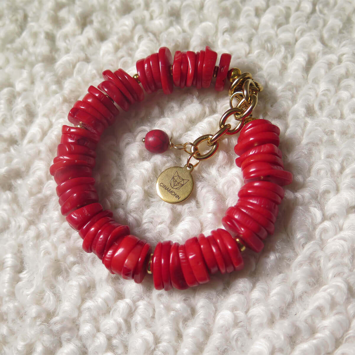 Masyvi apyrankė iš raudonojo koralo su plieniniu užsegimu  ir grandinėlės prailginimu.