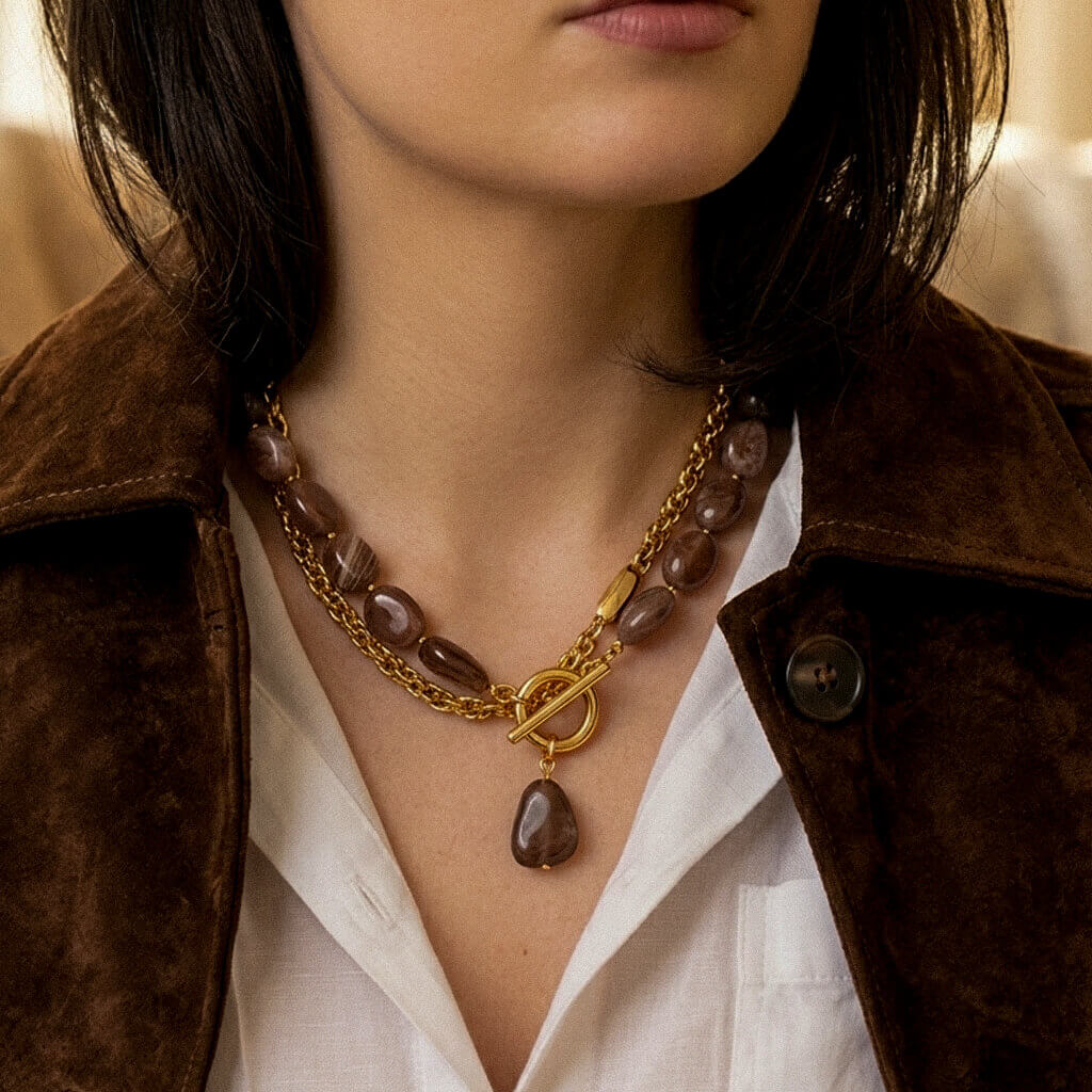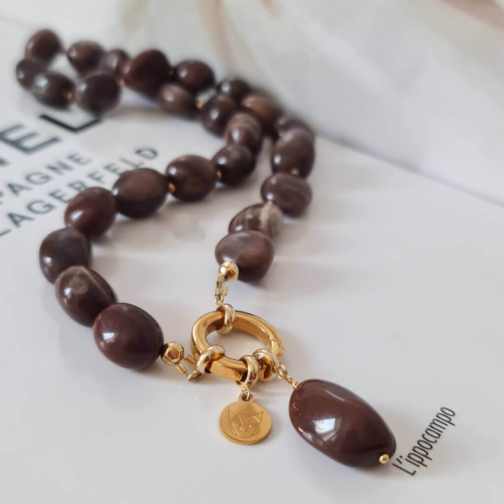 Natūralus rudas mėnulio akmuo žavi savo giliais, šokoladiniais tonais ir subtiliais šviesos atspindžiais. Kiekvienas akmuo unikalus, su savitu raštu, tarsi mažas gamtos fragmentas.