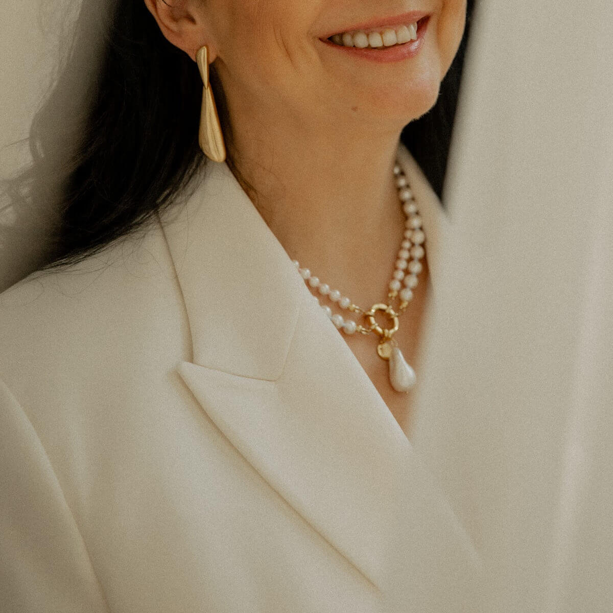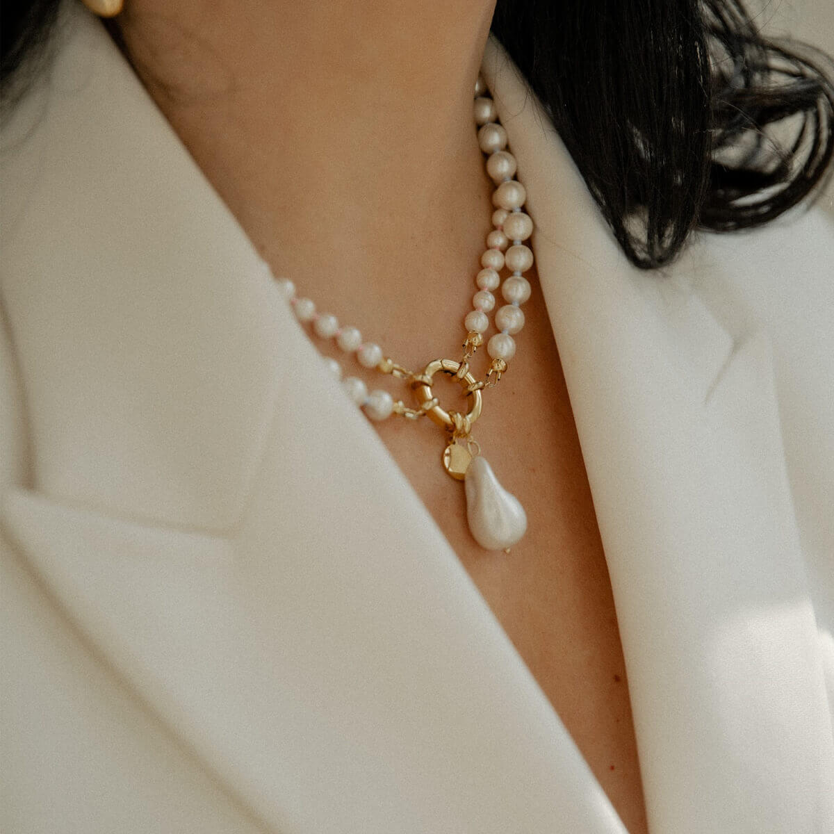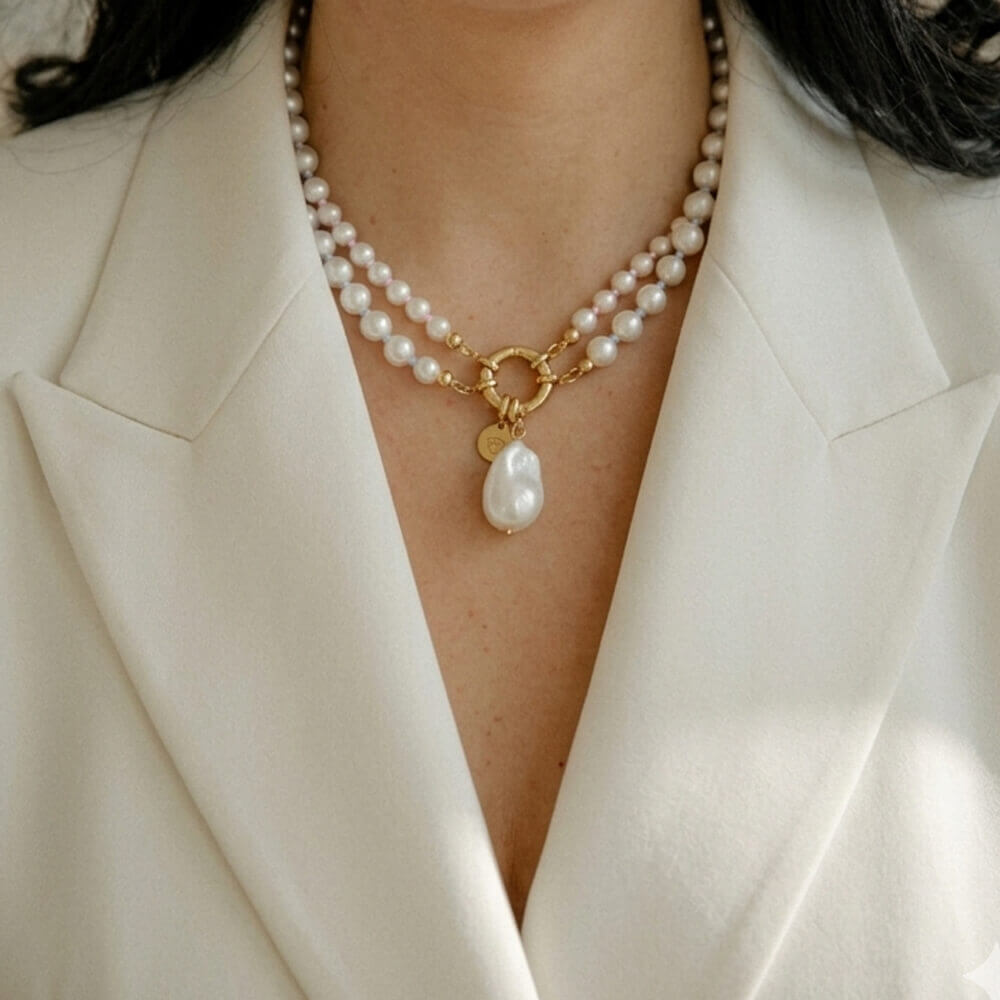 Vėrinį gali nešioti kaip dvieilį arba atskirai – pasirinkdama vieną iš eilių pagal savo nuotaiką ir stilių ir spalvą. Nuimamas pakabukas su netaisyklingos formos perlu leidžia dar labiau keisti įvaizdį – nuo kasdienio minimalizmo iki išraiškingesnio akcento.