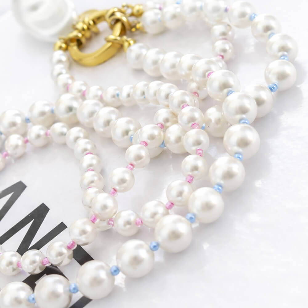 Šis dvigubas perlų vėrinys sukurtas iš dviejų skirtingų nuotaikų eilių – stambesni perlai papildyti švelniais žydrais intarpais 🔵, o mažesni – romantiškais rožiniais akcentais 🩷. Ši spalvų dermė suteikia vėriniui gyvumo ir lengvo žaismingumo, išlaikant klasikinę eleganciją.