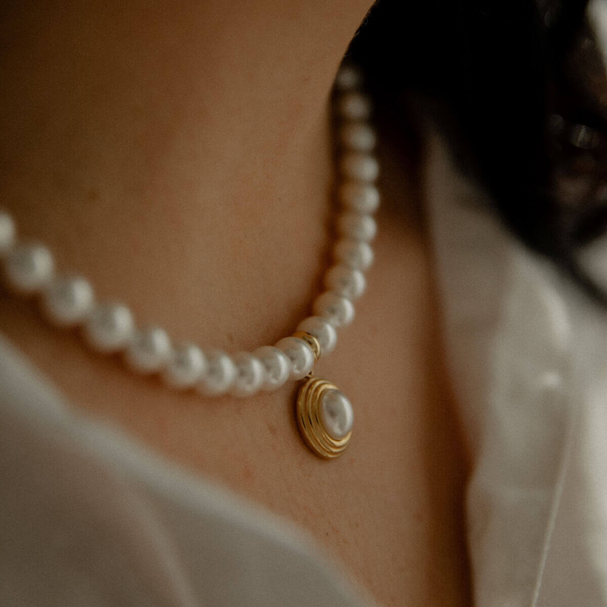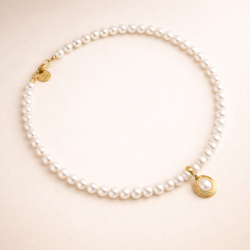 Šis perlų vėrinys – tai subtili nuoroda į laikus, kai elegancija buvo savaime suprantama. Vienodo dydžio perlai kuria švarią, harmoningą liniją, o auksinis pakabukas suteikia šiuolaikiško švelnumo ir išskirtinumo.