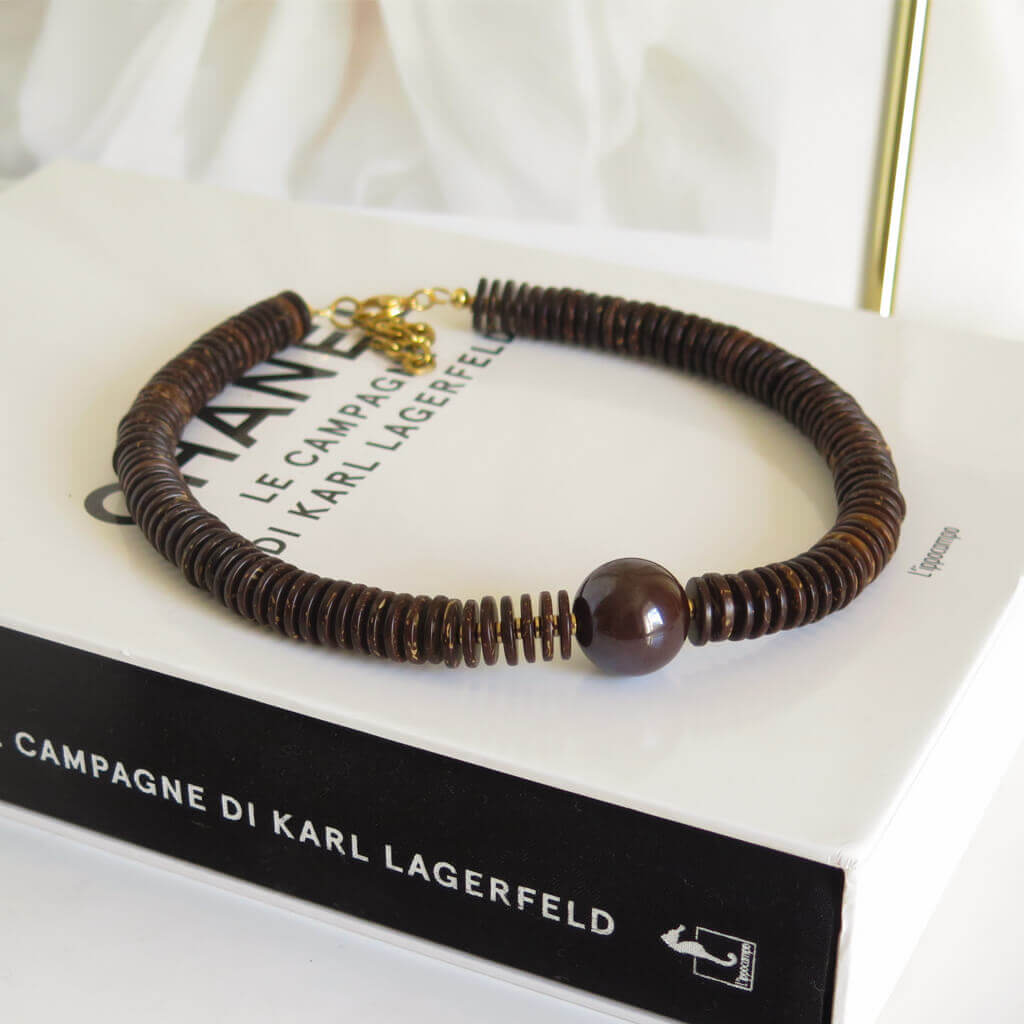 Elegantiškas plokščių kokoso karoliukų vėrinys – natūralumo ir rafinuotumo derinys. Centre – rudas pocelianio burbulas.