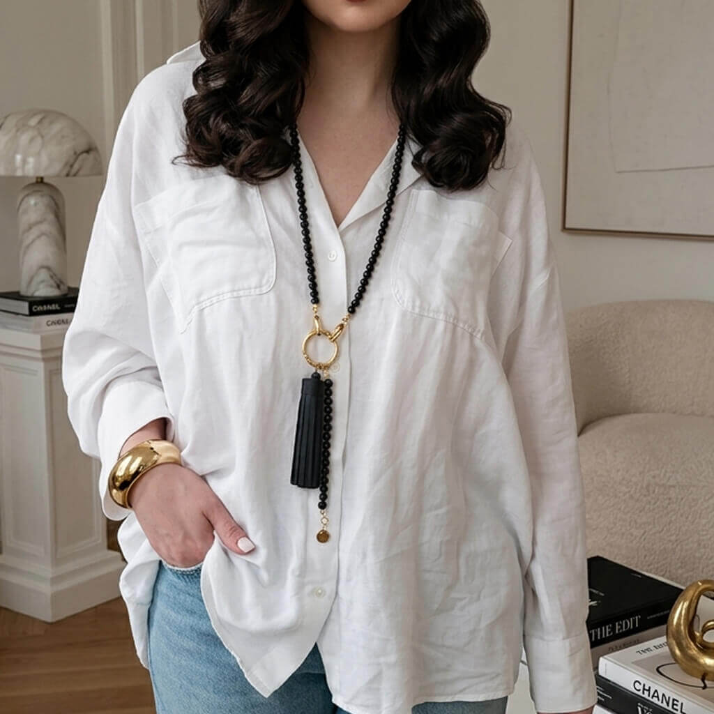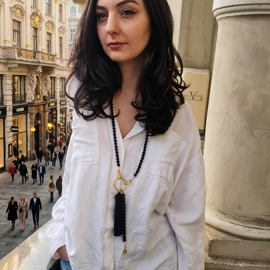Šis ilgas vėrinys iš natūralaus onikso – tai stiprybės ir vidinės ramybės simbolis. Juodi, subtiliai blizgūs karoliukai kuria išgrynintą, modernų siluetą, kuris lengvai dera tiek prie kasdienio, tiek prie vakarinio įvaizdžio.