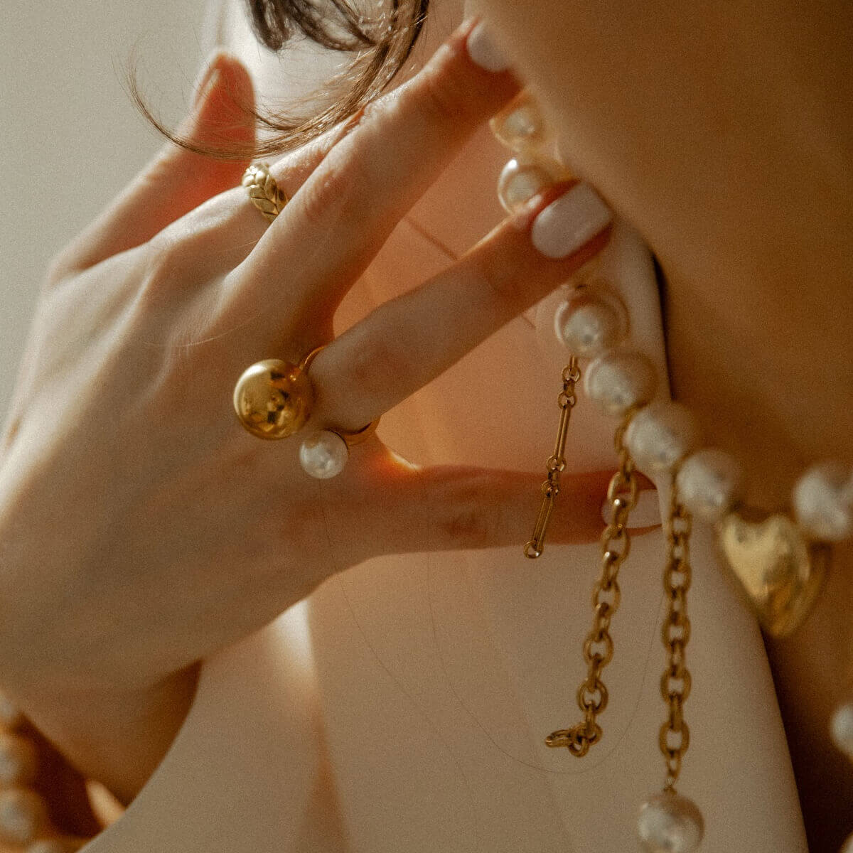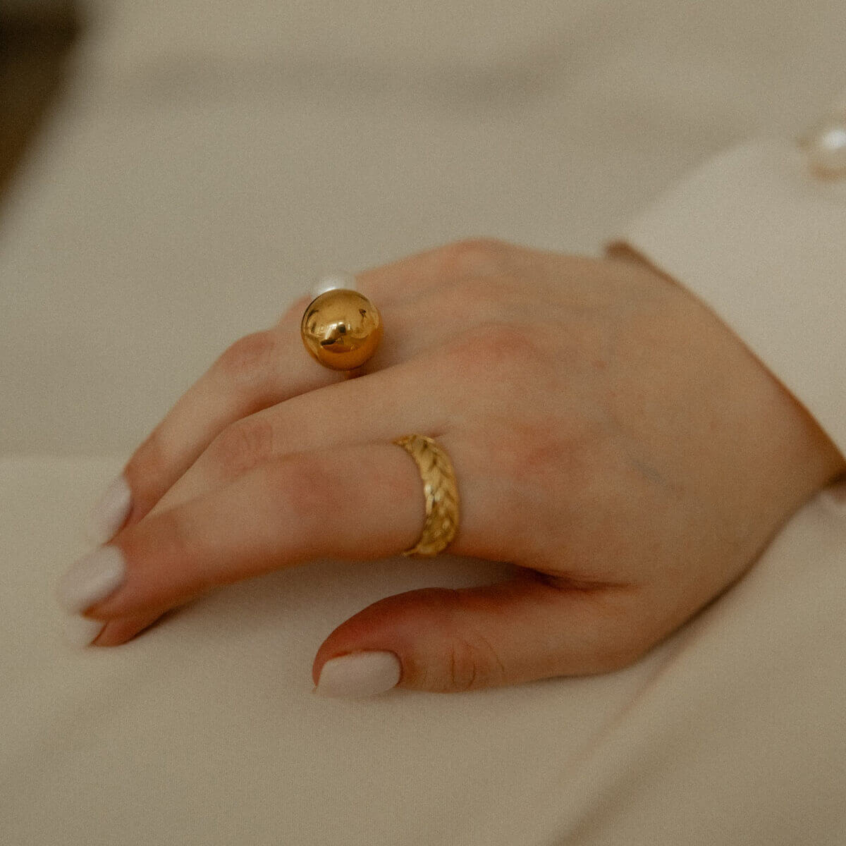 Šis žiedas subtiliai sujungia dvi priešingybes – perlo švelnumą ir šiltą aukso spindesį.